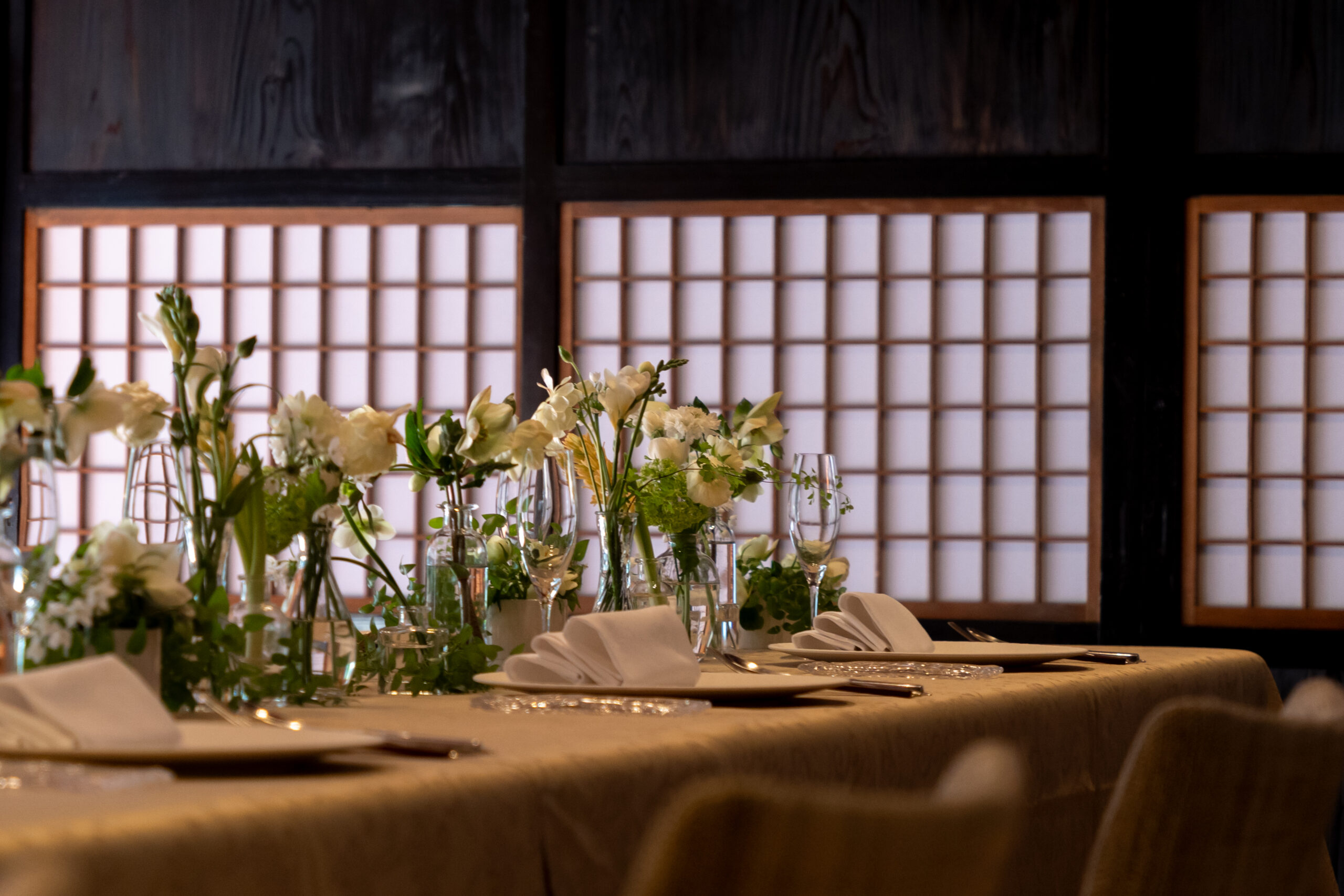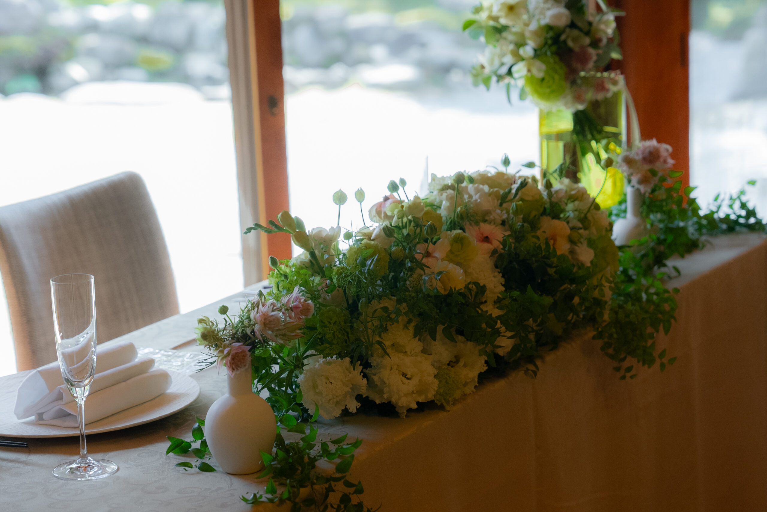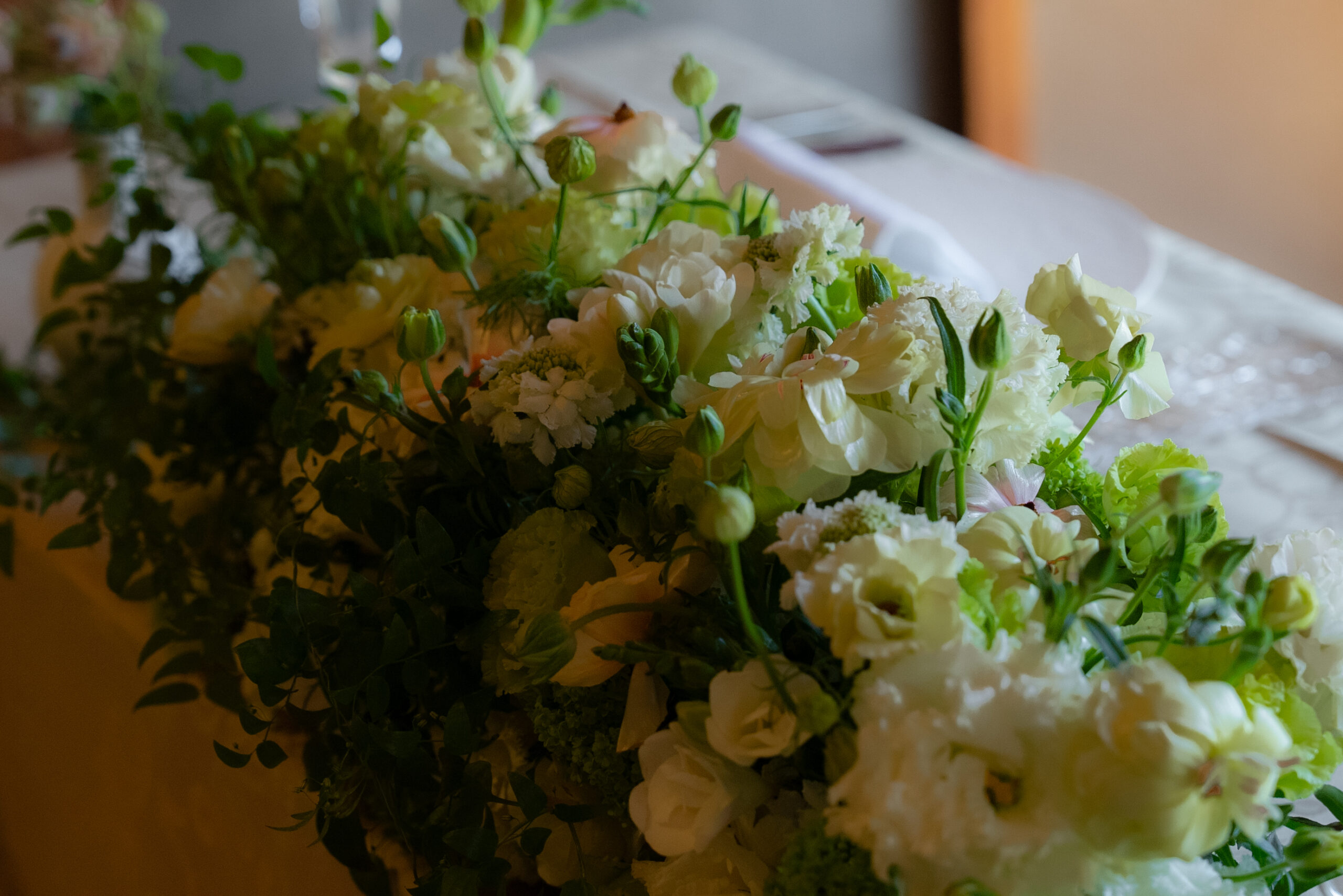 ご婚礼という特別な一日が、かけがえのない思い出となるように。会場の雰囲気やおふたりのご希望、季節の花々に寄り添いながら、華やかさと心地よさを兼ね備えた装花をご提案いたします。おふたりらしさが感じられる、あたたかで美しい空間づくりをお手伝いいたします。